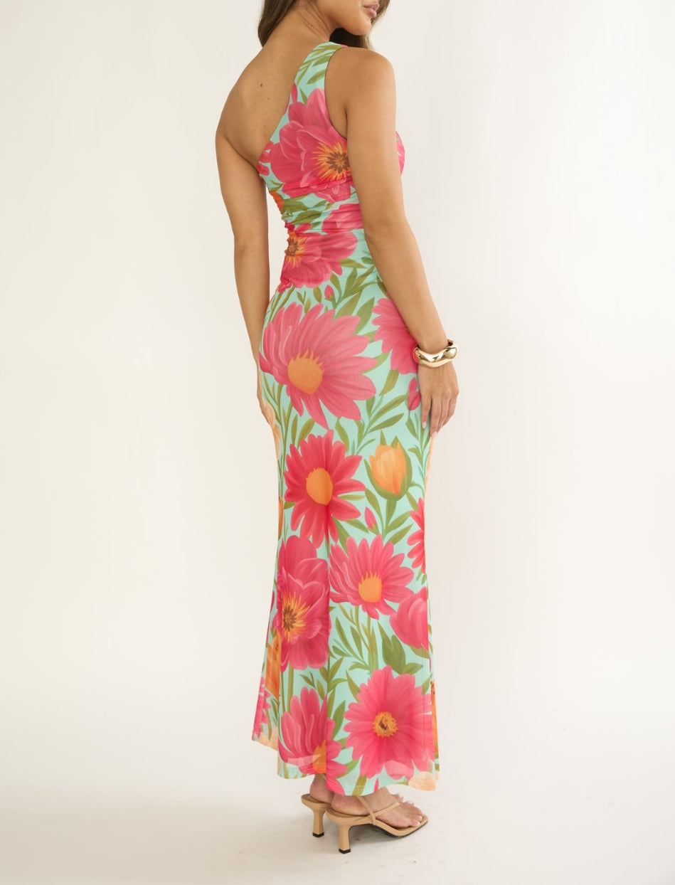 • Mesh Cocktail Dress - Floral One Shoulder